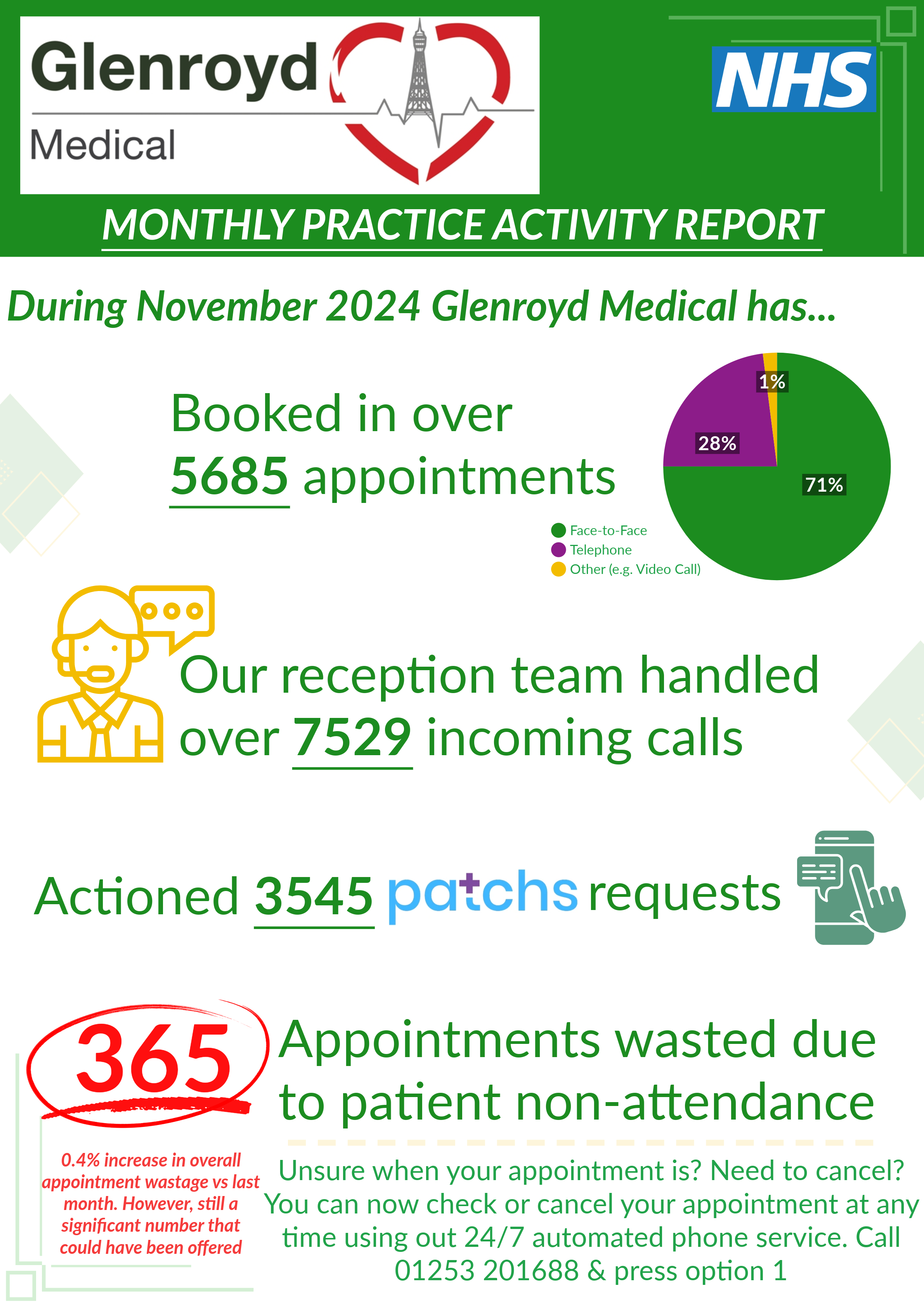 Each of these practice activity reports is available to view in Moor Park’s patient waiting area. Once the next month’s activity has been collected, it is replaced by the most up-to-date report.