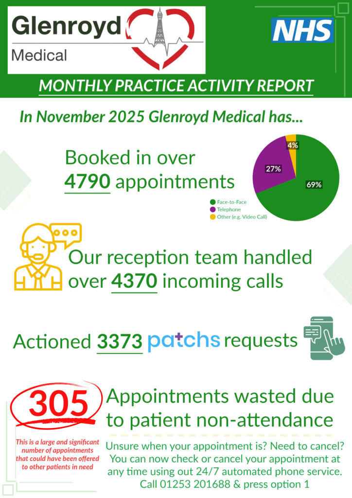 Each of these practice activity reports is available to view in Moor Park’s patient waiting area. Once the next month’s activity has been collected, it is replaced by the most up-to-date report.